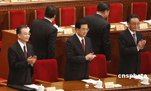 3月3日,全國(guó)政協(xié)十一屆二次會(huì)議在北京人民大會(huì)堂開幕。國(guó)家主席胡錦濤、全國(guó)人大常委會(huì)委員長(zhǎng)吳邦國(guó)、國(guó)務(wù)院總理溫家寶出席開幕式。中新社發(fā) 盛佳鵬 攝