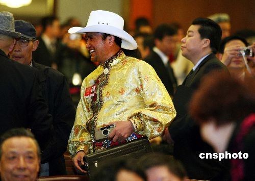 全國政協十一屆二次會議3月3日下午在人民大會堂開幕,一名少數民族委員攜相機和電腦出席大會。中新社發 宋吉河 攝