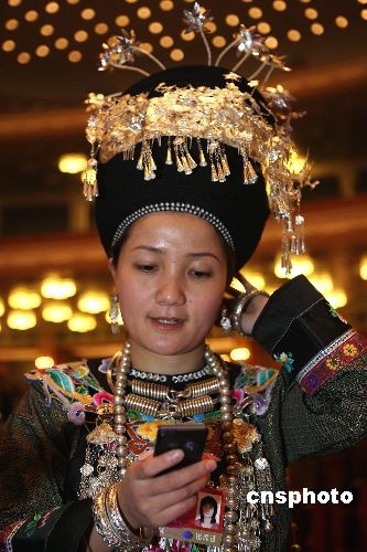 3月4日上午,十一屆全國人大二次會(huì)議預(yù)備會(huì)在北京人民大會(huì)堂舉行。來自重慶市黔江區(qū)的苗族女代表李小燕通過手機(jī)向家鄉(xiāng)“播報(bào)”大會(huì)盛況。中新社發(fā) 任晨鳴 攝