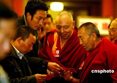 兩會期間,幾位參加全國政協十一屆二次會議的宗教界人士,新奇地翻閱“兩會”駐地提供的《會議生活服務指南》。今年的“兩會”駐地為宗教界代表委員、少數民族代表委員提供了眾多的貼心服務。中新社發 宋吉河 攝