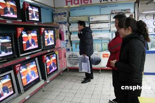 2009年3月5日上午,江蘇省大豐市一家超市家電部,顧客在收看溫家寶總理作政府工作報告。中新社發 周古凱 攝