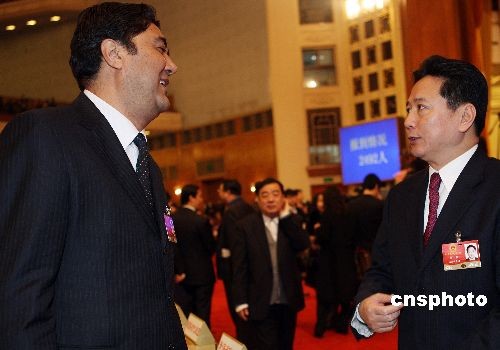 3月5日上午,十一屆全國人大二次會議在北京人民大會堂開幕,全國人大代表、山西省副省長李小鵬(右)會前與新疆維吾爾自治區主席努爾·白克力交談。中新社發 任晨鳴 攝