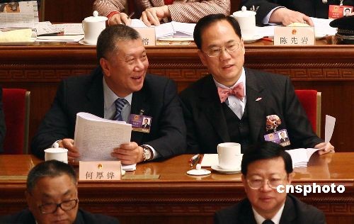 3月5日上午,十一屆全國人大二次會議在北京人民大會堂開幕。香港特別行政區行政長官曾蔭權、澳門特別行政區行政長官何厚鏵列席會議并在主席臺就座。中新社發 杜洋 攝