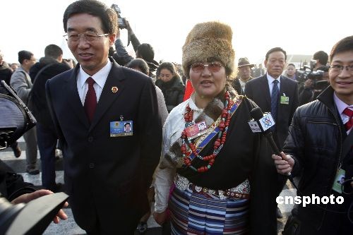 3月5日上午,十一屆全國人大二次會議在北京人民大會堂開幕,來自西藏的全國人大代表色珠與列席大會開幕會的西藏自治區(qū)人民檢察院檢察長張培中步入會場。中新社發(fā) 盛佳鵬 攝