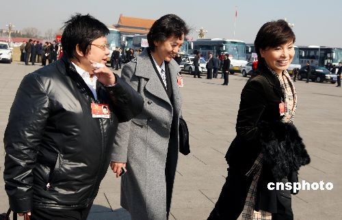 3月8日,眾多女委員在國際婦女節當日出席全國政協十一屆二次會議第三次全體會議。圖為央視女主持人李瑞英、海霞和歌星韓紅在會后輕松步出人民大會堂。中新社發 楊可佳 攝