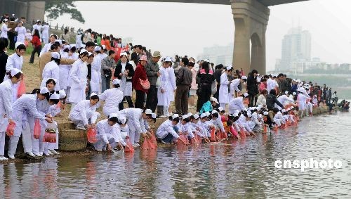 三月八日,為慶祝三八國(guó)際勞動(dòng)?jì)D女節(jié),廣西南國(guó)早報(bào)網(wǎng)組織南寧市女性在南寧母親河——邕江放生百萬(wàn)尾魚苗。中新社發(fā) 蔣雪林 攝