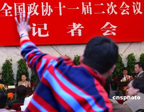 全國政協(xié)十一屆二次會(huì)議3月8日就2010年5月上海舉辦世界博覽會(huì)舉行記者會(huì),香港大公報(bào)記者踴躍提問。萬季飛、周漢民、成岳沖、楊瀾等四位全國政協(xié)委員回答了籌備中的上海世界博覽會(huì)資金來源,籌備進(jìn)度情況,外界關(guān)注的美國、臺(tái)灣參展情況,金融危機(jī)的影響及民營(yíng)企業(yè)參展情況等問題。與會(huì)中外記者表現(xiàn)出極大關(guān)注,爭(zhēng)相提問。中新社發(fā) 宋吉河 攝