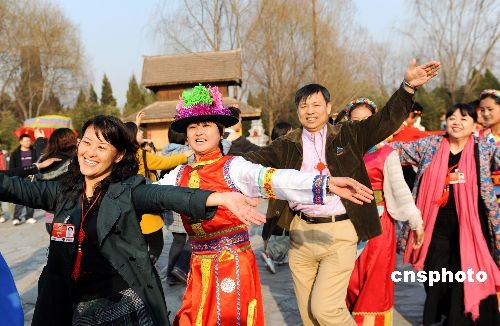 3月8日下午,出席全國政協十一屆二次會議的部分政協委員利用休會時間,來到北京中華民族博物院(中華民族園),與民族演員一起感受民族文化。 中新社發 遠舟 攝