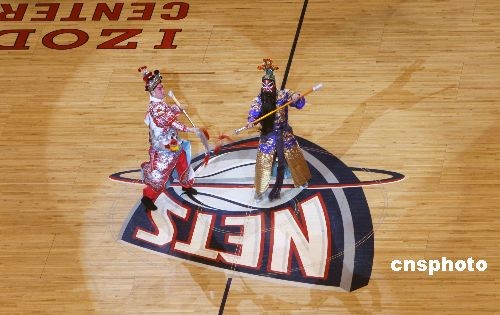 當地時間3月8日晚,美國大紐約地區“2009中華之夜”晚會在NBA新澤西網隊主場舉行,NBA賽場吹出一陣“中國風”。在新澤西籃網對陣紐約尼克斯的賽間休息時,傳統京劇表演令許多美國球迷倍感新奇。中新社發 魏晞 攝