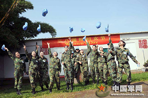 3月8日,中國(guó)第九批赴剛果(金)維和醫(yī)療分隊(duì)的女隊(duì)員在剛果(金)東部城市布卡武的維和軍營(yíng)歡慶三八國(guó)際婦女節(jié)。中國(guó)第九批赴剛果(金)維和醫(yī)療分隊(duì)共12名女隊(duì)員,全部來自蘭州軍區(qū)駐陜西的軍隊(duì)醫(yī)院。