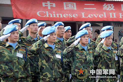 中國第九批赴剛果(金)維和醫療分隊舉行升國旗儀式,紀念三八國際婦女節。武國強 攝