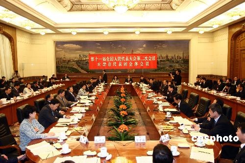 3月9日,全國人大天津代表團在人民大會堂舉行全團會議,審議全國人大常委會委員長吳邦國全國人大常委會工作報告,并向記者開放。中新社發(fā) 杜洋 攝