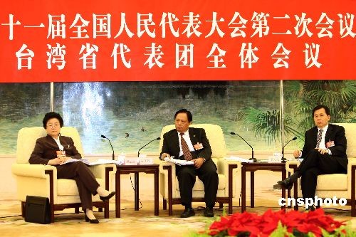 3月9日,全國人大臺灣省代表團在人民大會堂舉行全體會議,審議全國人大常委會委員長吳邦國全國人大常委會工作報告。圖為全國臺聯會長梁國揚代表(中),全國臺聯理事魏麗惠(左)和臺盟中央副主席陳蔚文出席會議。中新社發 杜洋 攝