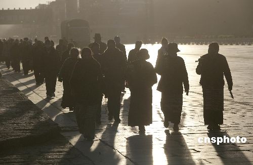 3月10日清晨,西藏拉薩布達(dá)拉宮門前來自各地的信眾絡(luò)繹不絕。中新社發(fā) 劉震 攝