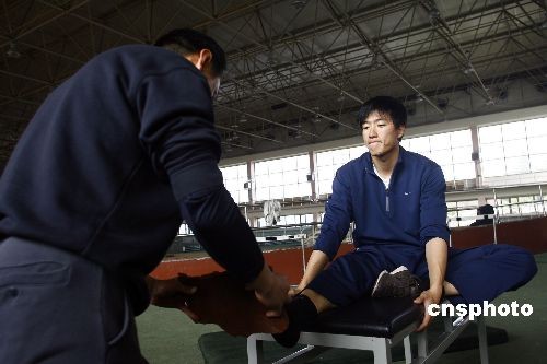 3月10日上午, 劉翔在上海莘莊基地開始進行正式訓練,在訓練間隙,孫海平教練用一塊海綿來幫助訓練劉翔右腳的靈敏性。孫海平教練表示:由于劉翔的傷勢剛剛恢復,右腳踝關節力量還不夠,用海綿訓練是為了增加劉翔右腳踝的靈活性!敝行律绨l 湯彥俊 攝