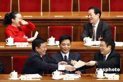 3月10日,第十一屆全國人民代表大會第二次會議在人民大會堂舉行第三次全體會議,聽取最高人民法院院長王勝俊作最高人民法院工作報告;聽取最高人民檢察院檢察長曹建明作最高人民檢察院工作報告。圖為會議開始前已在主席臺就坐的人大代表交談。中新社發 盛佳鵬 攝