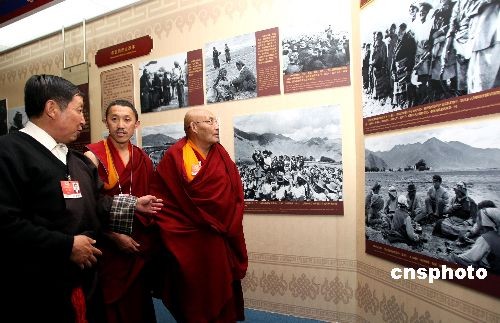 3月11日,參加全國(guó)政協(xié)會(huì)議的宗教界委員參觀在北京民族宮舉辦的西藏民主改革50年大型展覽。中新社發(fā) 傅丹丹 攝