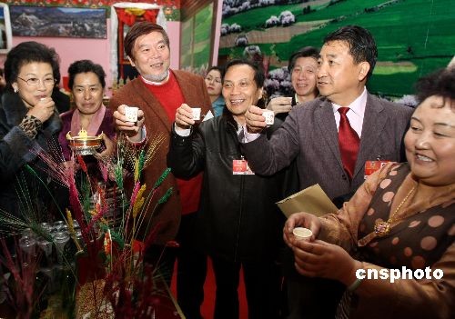 3月11日,參加全國政協會議的文藝界委員參觀在北京民族宮舉辦的西藏民主改革50年大型展覽。圖為委員們在西藏民居風格的布景館里共飲酥油茶。中新社發 傅丹丹 攝