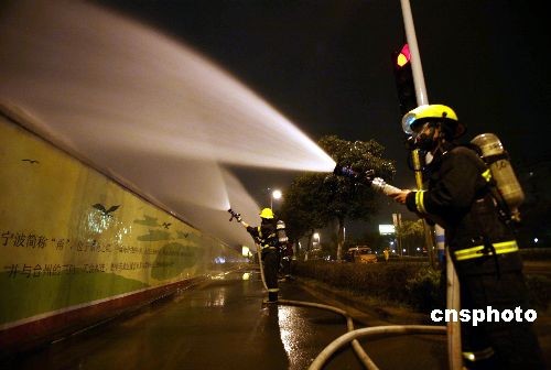 圖為消防官兵沿途對工地進行稀釋。中新社發(fā) 袁帆 攝