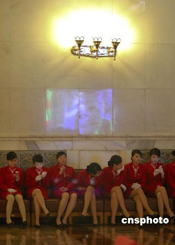3月12日,全國政協十一屆二次會議舉行閉幕大會。大會開始前,服務人員在人民大會堂的椅子上休息。中新社發 盛佳鵬 攝