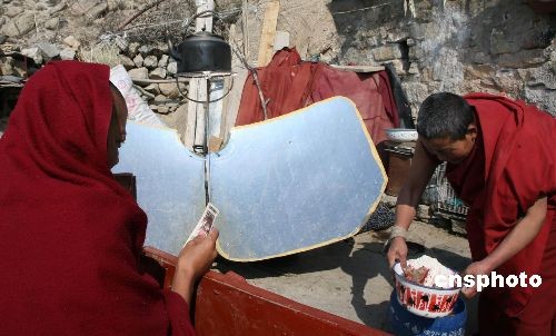 3月18日,拉薩哲蚌寺的僧尼在用太陽灶燒水。西藏首府拉薩市地處海拔3650米的河谷沖擊平原,是世界上海拔最高的城市之一。這里年日照時數3000小時以上,故有"日光城"之美稱。為節約能源,拉薩市正在大范圍推廣太陽灶。據稱,在拉薩市,一臺太陽能灶每年可節約燒柴12立方米。中新社發 王林 攝