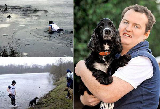 狗主人破冰救寵。據英國媒體報道,有時人類最好的朋友也需要朋友。因此,當馬克(Marc Greenhalgh)的可卡犬賈維斯(Jarvis)被困在結冰的湖中時,他義無反顧的跳進去拯救它。