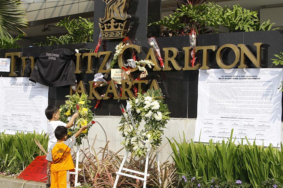 7月18日,印度尼西亞首都雅加達的民眾紛紛來到發(fā)生爆炸的萬豪酒店和麗嘉酒店,向死難者獻花表示哀悼。