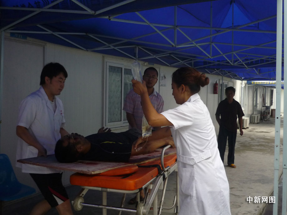 25日凌晨四點(diǎn)鐘左右,汶川縣境內(nèi)國道二一三線徹底關(guān)大橋被山上飛下來的巨石砸斷,已造成100米的橋面坍塌,7輛汽車受損,12人不同程度受傷,3人死亡,都汶路通行中斷。圖為汶川縣人民醫(yī)院正在積極搶救傷員。 汶新 攝