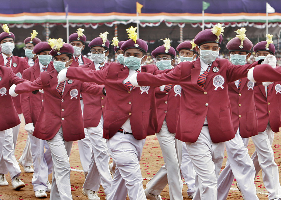 慶祝獨立62周年閱兵式上的印度童軍在做隊列表演。