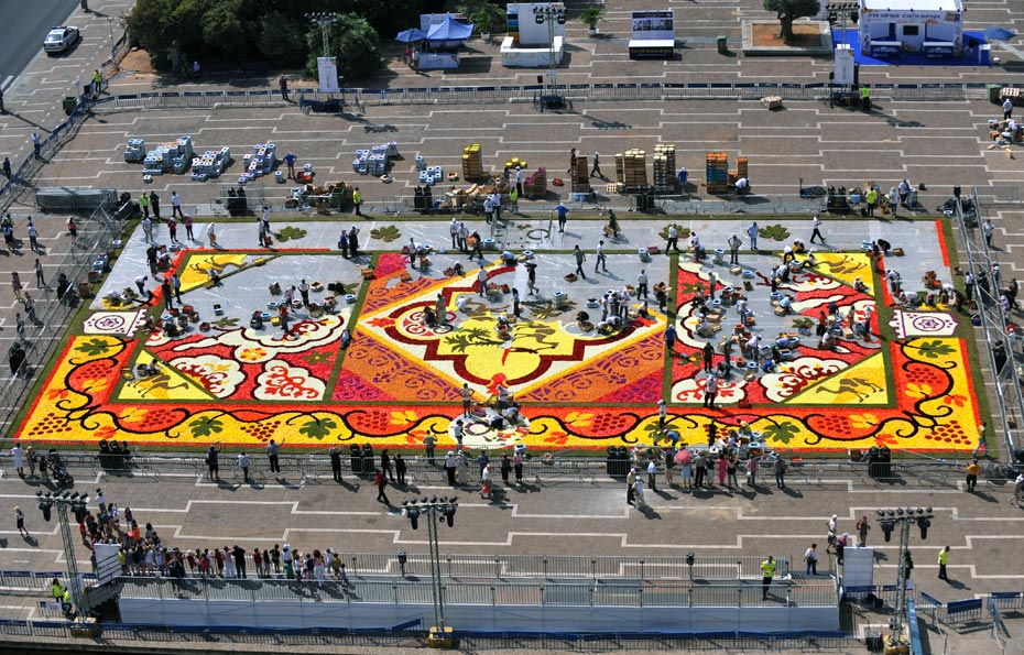 據悉,原本計劃全部使用以色列的鮮花,但由于當地的鮮花產量不足,只能從布魯塞爾進口,這批鮮花每朵花的直徑都在20厘米左右。百名志愿者們費時7小時精心鋪成了這張花毯,這張鮮花地毯將展示三天,隨后將被生態埋葬。