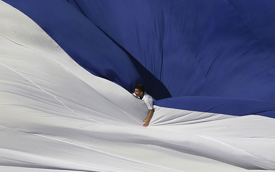 9月17日,在耶路撒冷的一個體育場內,一名以色列男孩在一幅巨大的、鋪展開的旗子上玩耍。它被吉尼斯世界紀錄評為世界上最大的旗子。圖片來源:中國新聞網