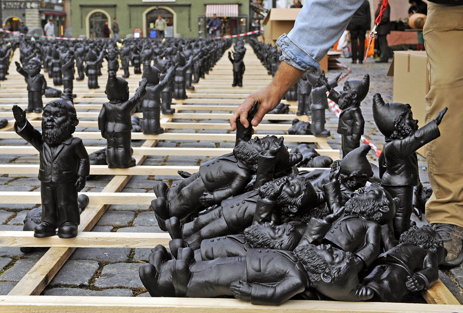 10月14日,德國施特勞賓市街頭擺放了1250個(gè)行納粹禮的花園土地神像,“行納粹禮的花園土地神”其實(shí)是一款雕塑作品,是由59歲的德國藝術(shù)家奧特馬爾·赫勒爾創(chuàng)作的目的在于提醒人們警惕法西斯思想,反對使用法西斯思想控制大眾。