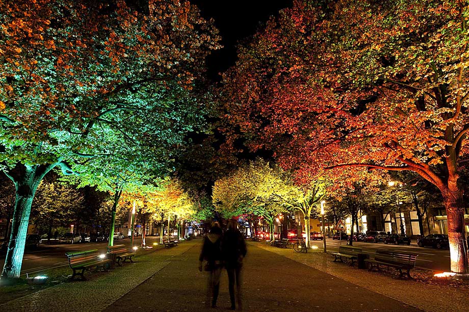 周二晚(10月13日),德國首都柏林,著名的林蔭大道“菩提樹下大街”在“燈節”預演中被五彩燈飾照亮。10月14日德國柏林迎來一年一度的“燈節”。圖片來源:中國新聞網