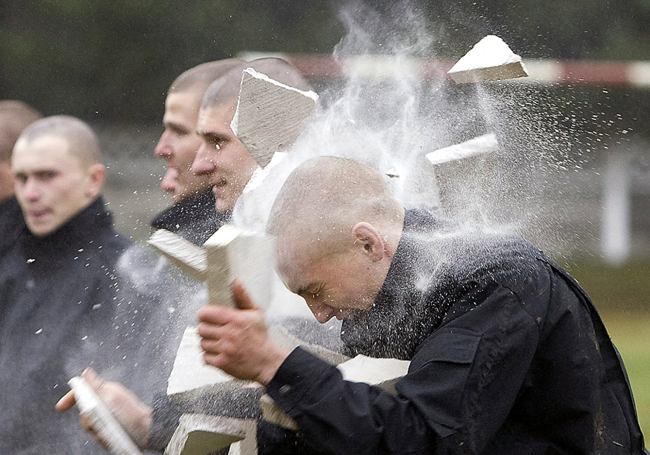 周三(10月14日),白俄羅斯一名士兵在軍營(yíng)里展示他的“鐵頭功”。圖片來(lái)源:中國(guó)新聞網(wǎng)