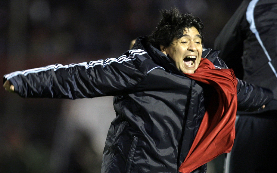 周四(10月15日),2010南非世界杯南美區(qū)預選賽最后一輪比賽中,阿根廷1-0取勝烏拉圭,正式進軍南非世界杯,阿隊主教練馬拉多納狂喜不已。圖片來源:中國新聞網