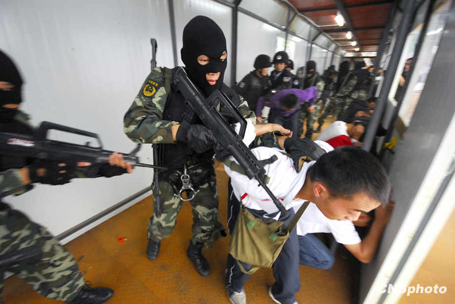 10月23日下午3時40分,推進(jìn)“平安重慶”建設(shè)突發(fā)事件應(yīng)急演練在該市渝中區(qū)大田灣體育場舉行,重慶各警種突精銳力量重裝登場,將各類事件一一化解。圖為反劫持戰(zhàn)術(shù)演練中,武警特種作戰(zhàn)分隊(duì)、特警總隊(duì)突擊分隊(duì)發(fā)起攻擊,一舉捕殲了“恐怖分子”。 中新社發(fā) 郝飛 攝