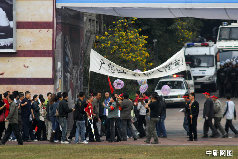 在演練現場,重慶發生“生化襲擊事件”,偵破工作正在進行時,受害人家屬以賠償和嚴懲兇手為由進行非法游行,堵塞交通和大型商場通道,擾亂交通秩序和正常經營,引來大量群眾圍觀。 郝飛 攝