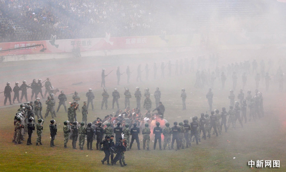 特警隊員兵分兩路,與瘋狂的“暴徒”對抗,現場指揮員命令特警隊員、武警兵力成“穿插分割” 隊形向前推進,形成T字隊形將鬧事人群進行分割、推進,但部分“暴徒”仍負隅頑抗,特警隊員將鬧事人群控制在范圍之內,并追擊企圖逃串的領頭分子,并采用網槍、徒手格斗、警械約束等方式實施抓捕并帶離。瘋狂的“暴徒”終于在正義的打擊下俯首就擒。