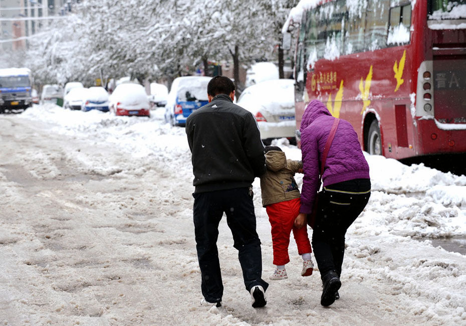 圖為11月11日太原市民在雪中出行。