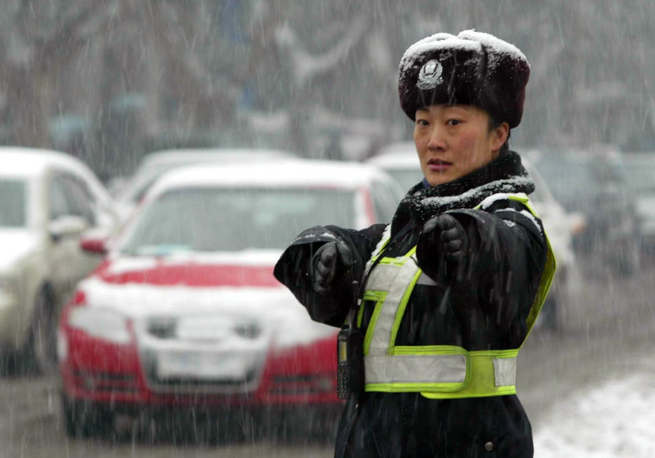 11月12日,在濟(jì)南市經(jīng)七緯二路口,濟(jì)南市公安局交警支隊(duì)市中大隊(duì)女子中隊(duì)民警黃雷冒雪疏導(dǎo)交通。袁鵬 攝