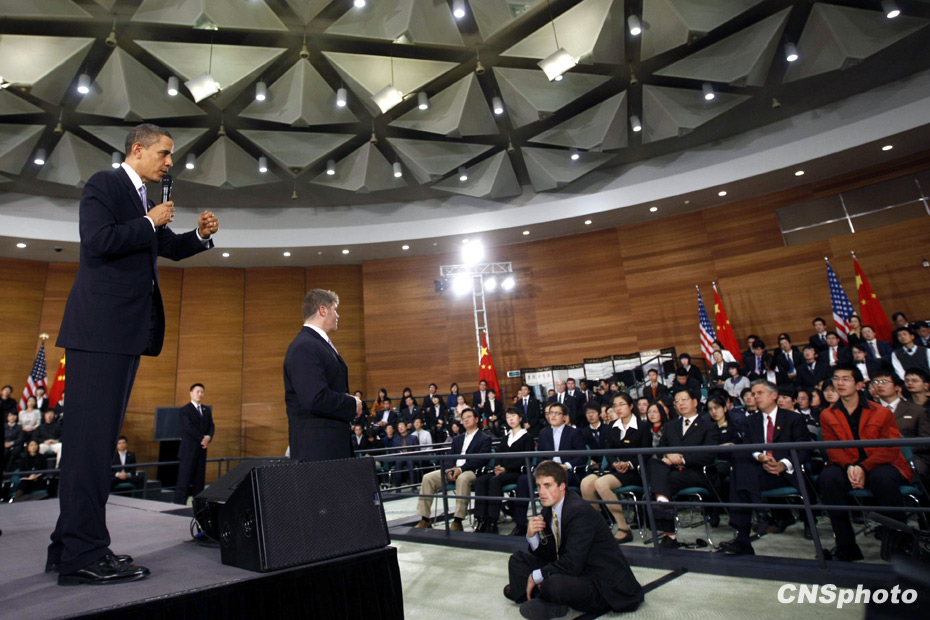 11月16日,正在上海訪問(wèn)的美國(guó)總統(tǒng)奧巴馬現(xiàn)身位于浦東的上海科技館,與四百余中國(guó)青年進(jìn)行面對(duì)面交流。 圖片來(lái)源:中國(guó)新聞網(wǎng)
