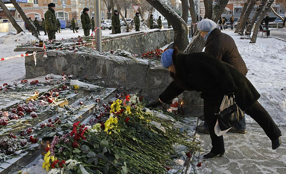 12月6日,在俄羅斯彼爾姆邊疆區首府彼爾姆市,人們在夜總會火災事故現場附近哀悼遇難者。圖片來源:中國新聞網