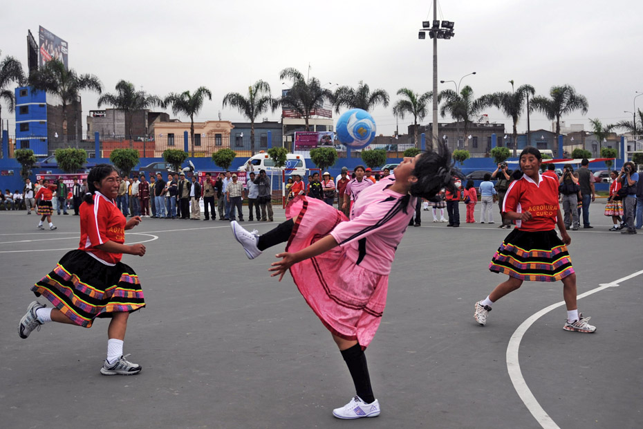 12月12日,秘魯印第安婦女在利馬國家體育場外舉辦了一場特別的足球賽,所有的球員均身著傳統服飾光腳上陣妙趣橫生。圖片來源:中國新聞網