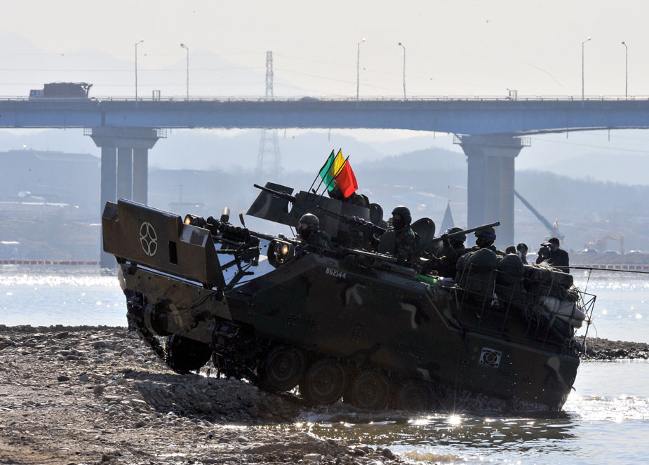 12月16日,韓國第20師團(tuán)機(jī)械化部隊(duì)在京畿道驪州南漢江一帶進(jìn)行大規(guī)模渡河實(shí)戰(zhàn)訓(xùn)練。該訓(xùn)練以培養(yǎng)戰(zhàn)斗執(zhí)行能力為重點(diǎn)。圖片來源:中國新聞網(wǎng)