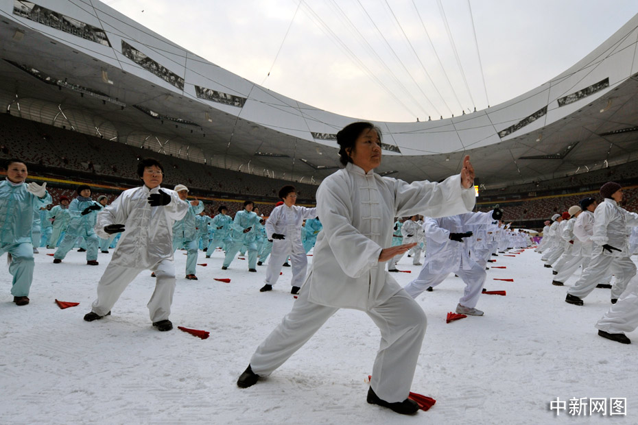 2010年1月1日上午,2010人在被冰雪覆蓋的鳥巢內表演了太極拳、武功扇等民族傳統健身項目。中新網記者 金碩 攝