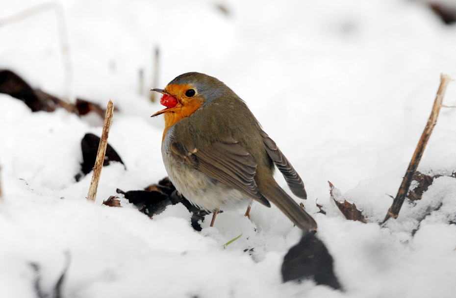 1月5日,德國(guó),一只知更鳥正在吃著大餐欣賞雪景。