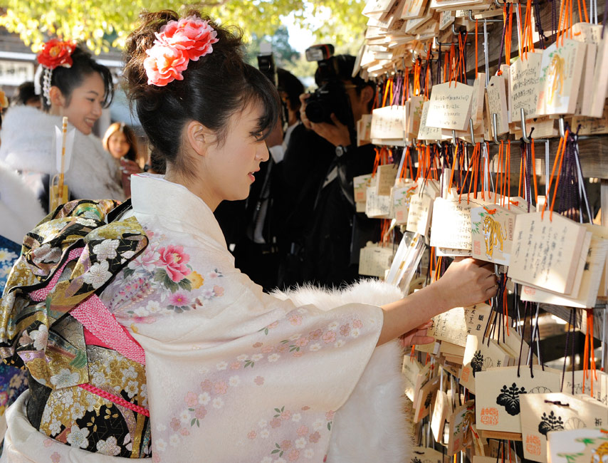 今年的1月11日,是日本傳統(tǒng)的成人節(jié),所有滿20歲的年輕人將宣告自己邁進了成人行列。1月8日,日本一家公司年滿20歲的年輕女孩紛紛穿上和服,到廟宇中祈福,提前慶祝成人節(jié)的到來。