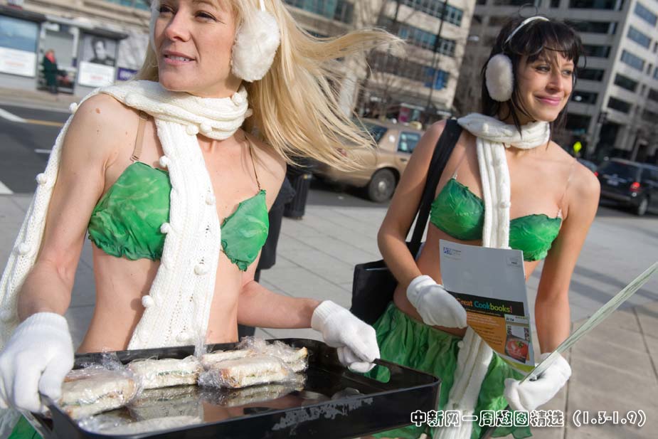 1月4日,善待動物組織(PETA)的成員在美國華盛頓法拉格特廣場上,冒著寒風身著比基尼向過往群眾派發豆腐三明治,并以此宣傳素食的生活方式。圖片來源:中國新聞網>>點擊觀看詳細內容