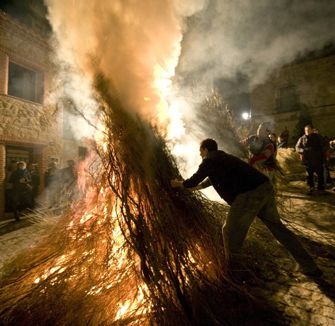 1月16日,西班牙一小村莊舉行一年一度的圣安東尼贖罪節,勇敢的騎士們騎上心愛的坐騎穿過熊熊燃燒的火堆。 圖片來源:中國新聞網