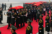1月19日上午,在海地地震中犧牲的八位中國(guó)維和警察遺體回國(guó)接機(jī)儀式在北京首都機(jī)場(chǎng)舉行。中新社記者 富田 攝